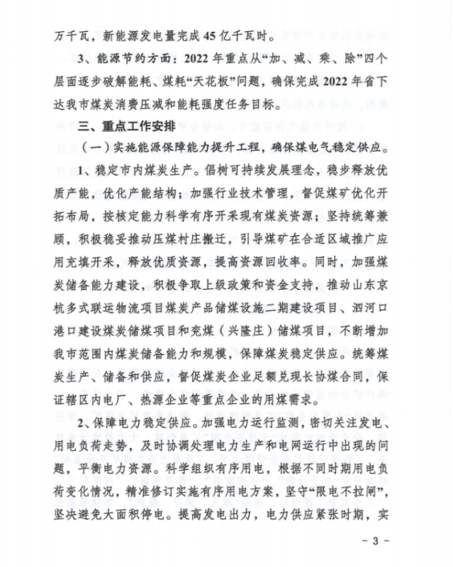 2、能源生產(chǎn)方面:(1)按照現(xiàn)行政策不變的情況下,2022年內(nèi)全市煤炭產(chǎn)量穩(wěn)定在5200萬噸左右;各類發(fā)電企業(yè)完成發(fā)電量490億千瓦時(shí)左右;(2)貫徹落實(shí)國(guó)家及省市煤電裝機(jī)相關(guān)政策,穩(wěn)步實(shí)施“上大壓小”,2022年煤電裝機(jī)容量穩(wěn)定在1050萬千瓦左右;(3)立足濟(jì)寧市資源稟賦實(shí)際,加快新能源開發(fā)利用和消納能力提升,力爭(zhēng)2022年底新能源總裝機(jī)實(shí)現(xiàn)350萬千瓦,新能源發(fā)電量完成45億千瓦時(shí)。