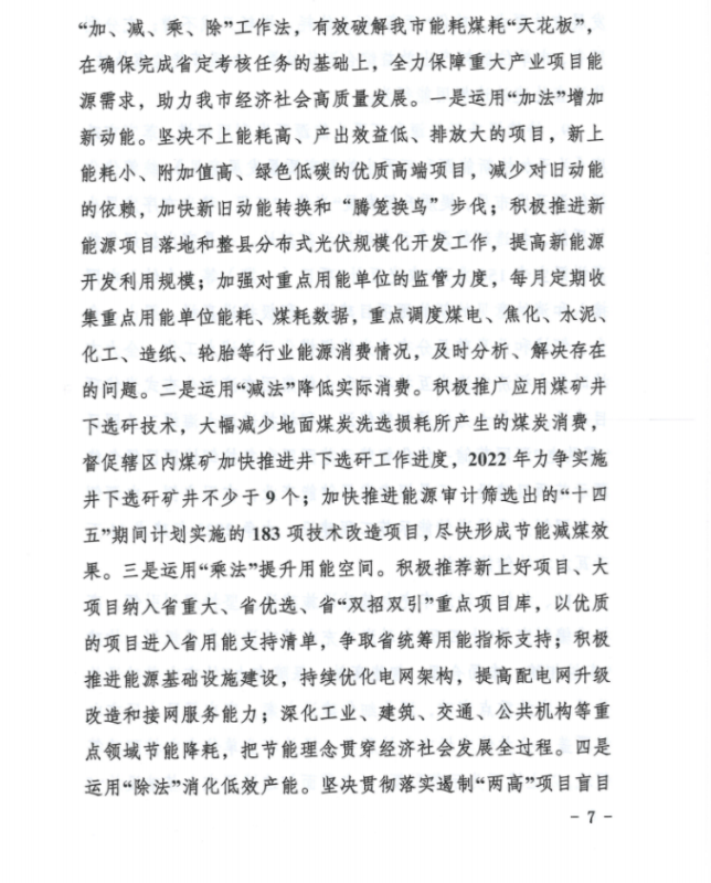 3、能源節(jié)約方面:2022年重點從“加、減、乘、除”四個層面逐步破解能耗、煤耗“天花板”問題,確保完成2022年省下達濟寧市煤炭消費壓減和能耗強度任務目標。