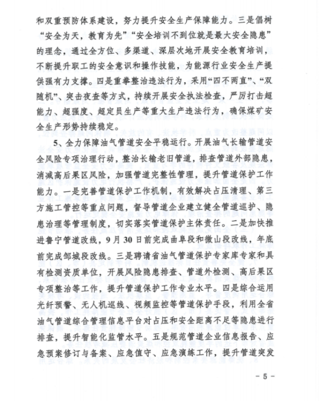 1、能源安全方面:全面落實安全監(jiān)管和設施保護職責,理順監(jiān)管體制機制,以安全責任落實為抓手,全力保障煤礦安全生產和電力、油氣管道設施安全運行,確保能源領域安全生產形勢持續(xù)穩(wěn)定向好。
