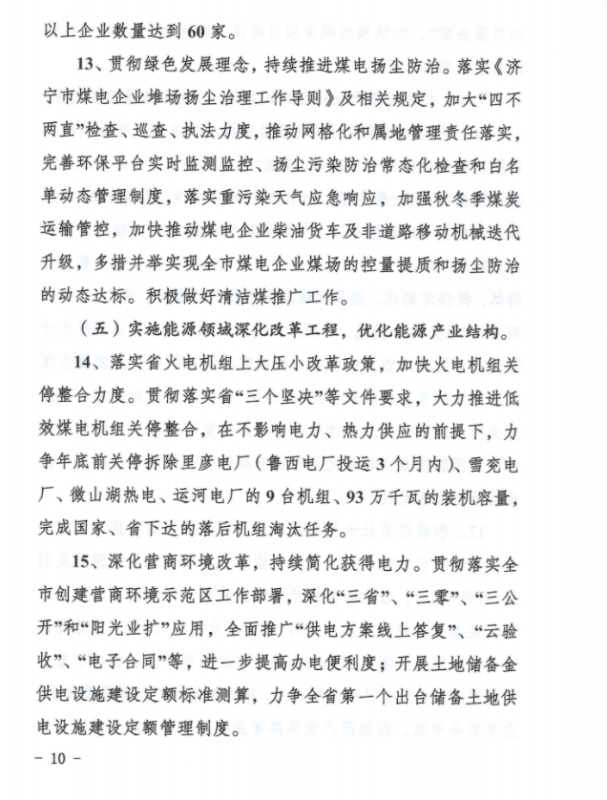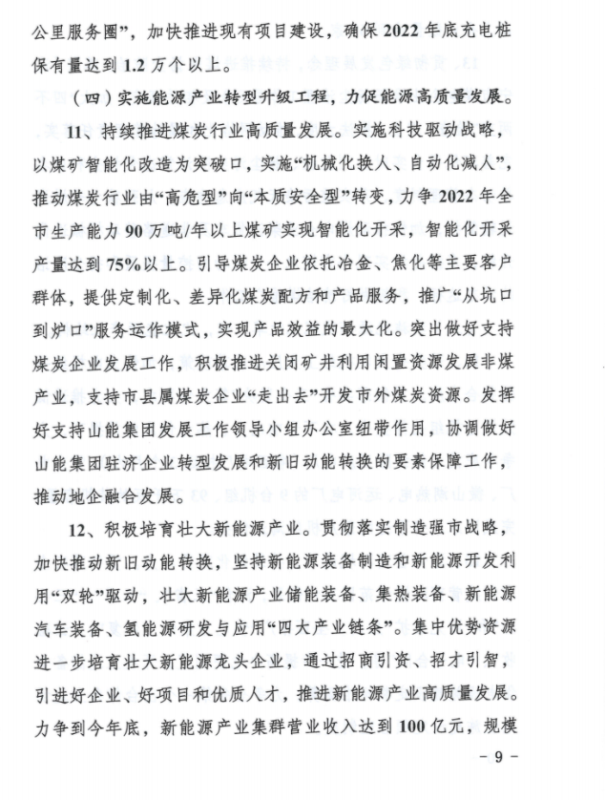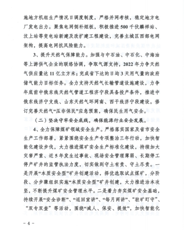 2、能源生產方面:(1)按照現行政策不變的情況下,2022年內全市煤炭產量穩(wěn)定在5200萬噸左右;各類發(fā)電企業(yè)完成發(fā)電量490億千瓦時左右;(2)貫徹落實國家及省市煤電裝機相關政策,穩(wěn)步實施“上大壓小”,2022年煤電裝機容量穩(wěn)定在1050萬千瓦左右;(3)立足濟寧市資源稟賦實際,加快新能源開發(fā)利用和消納能力提升,力爭2022年底新能源總裝機實現350萬千瓦,新能源發(fā)電量完成45億千瓦時。