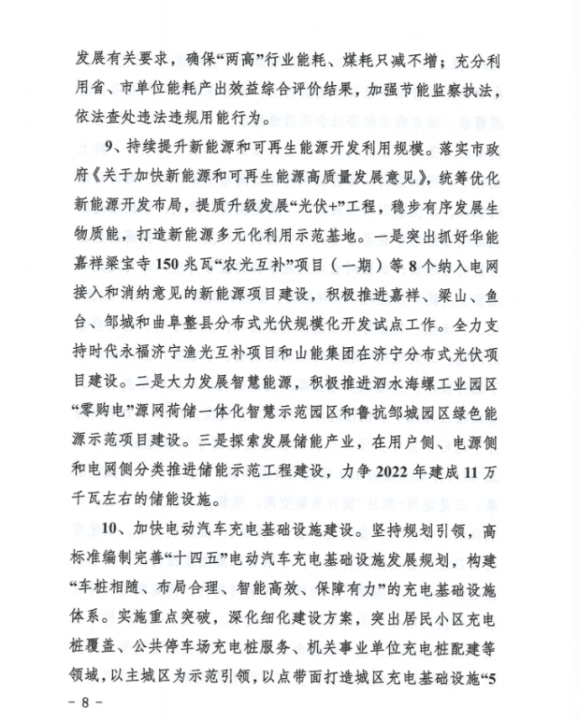 持續(xù)提升新能源和可再生能源開發(fā)利用規(guī)模。落實市政府《關于加快新能源和可再生能源高質量發(fā)展意見》,統(tǒng)籌優(yōu)化新能源開發(fā)布局,提質升級發(fā)展“光伏+”工程,穩(wěn)步有序發(fā)展生物質能,打造新能源多元化利用示范基地。一是突出抓好華能嘉祥梁寶寺150兆瓦“農光互補”項目(一期)等8個納入電網接入和消納意見的新能源項目建設,積極推進嘉祥、梁山、魚臺、鄒城和曲阜整縣分布式光伏規(guī)?;_發(fā)試點工作。全力支持時代永福濟寧漁光互補項目和山能集團在濟寧分布式光伏項目建設。二是大力發(fā)展智慧能源,積極推進泗水海螺工業(yè)園區(qū)“零購電”源網荷儲一體化智慧示范園區(qū)和魯抗鄒城園區(qū)綠色能源示范項目建設。三是探索發(fā)展儲能產業(yè),在用戶側、電源側和電網側分類推進儲能示范工程建設,力爭2022年建成11萬千瓦左右的儲能設施。