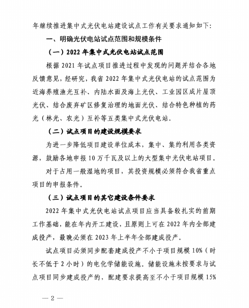 同步配套建成投產(chǎn)不小于項(xiàng)目規(guī)模10%(時(shí)長(zhǎng)不低于2小時(shí))的電化學(xué)儲(chǔ)能設(shè)施。儲(chǔ)能設(shè)施未按要求與試點(diǎn)項(xiàng)目同步建成投產(chǎn)的,配建要求提高至不小于項(xiàng)目規(guī)模15%(時(shí)長(zhǎng)不低于4小時(shí))。