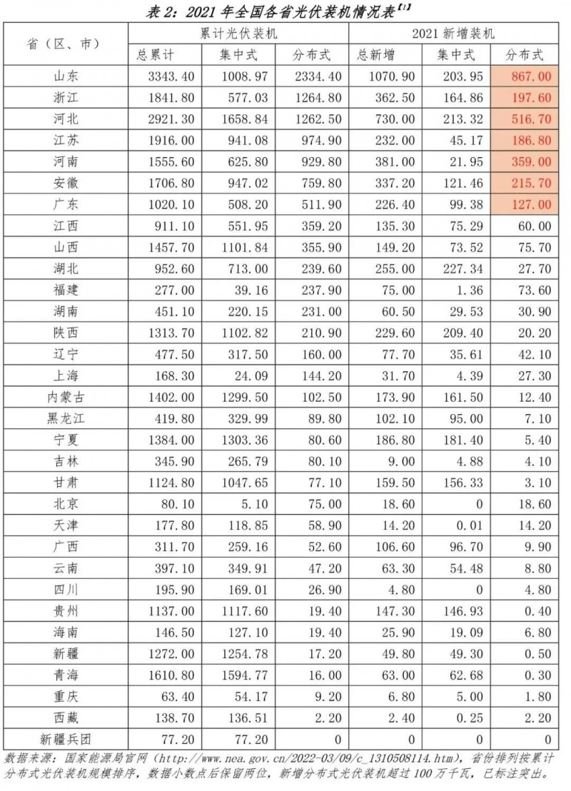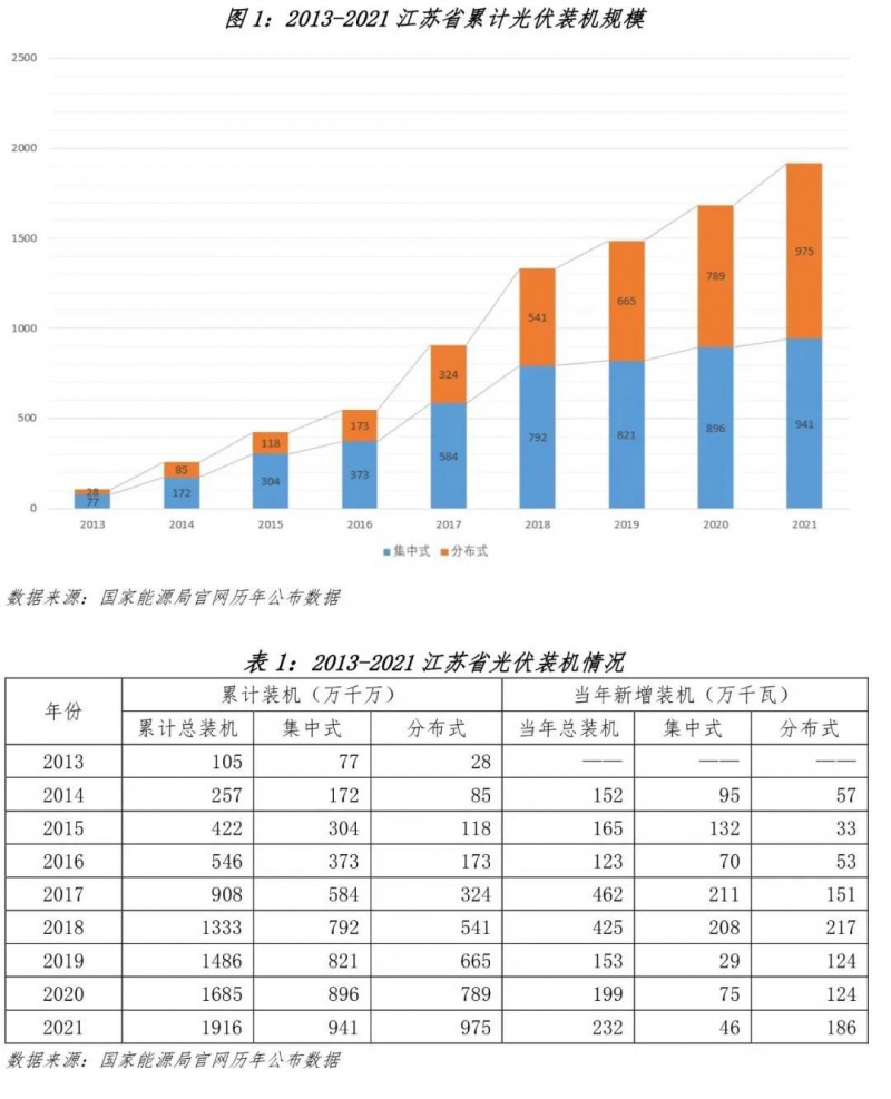 根據(jù)國家能源局官方公布的數(shù)據(jù),截至 2021 年底,江蘇省累計光伏裝機規(guī)模為1916 萬千瓦,其中,集中式光伏電站 941.08 萬千瓦,占比 49.12%,分布式光伏裝機為 974.9 萬千瓦,占比 50.88%。