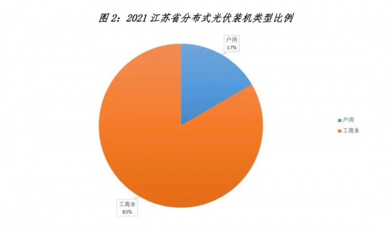 根據(jù)電網(wǎng)公司分布式光伏并網(wǎng)數(shù)據(jù),截止到 2021 年 12 月,江蘇分布式光伏累計并網(wǎng)規(guī)模為 982.91 萬千瓦,其中,累計戶用光伏并網(wǎng) 163.37 萬千瓦,約占比17%;累計工商業(yè)分布式光伏并網(wǎng) 819.54 萬千瓦,約占比 83%??梢?,江蘇分布式光伏市場以工商業(yè)分布式為絕對主導。