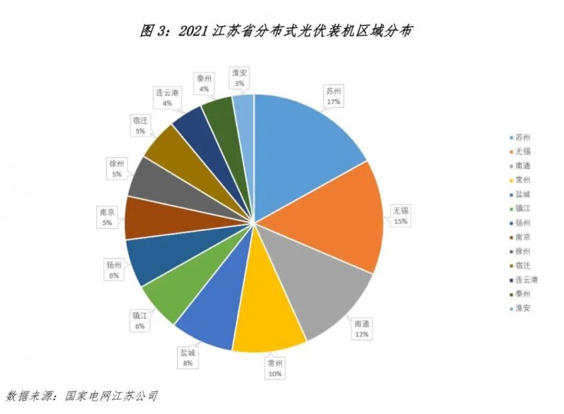 2021 年 9 月,國家能源局官網(wǎng)公布了全國整縣(市、區(qū))屋頂分布式光伏開發(fā)試點名單,在 676 個試點縣(市、區(qū))中江蘇共有 59 個,數(shù)量居全國第三。