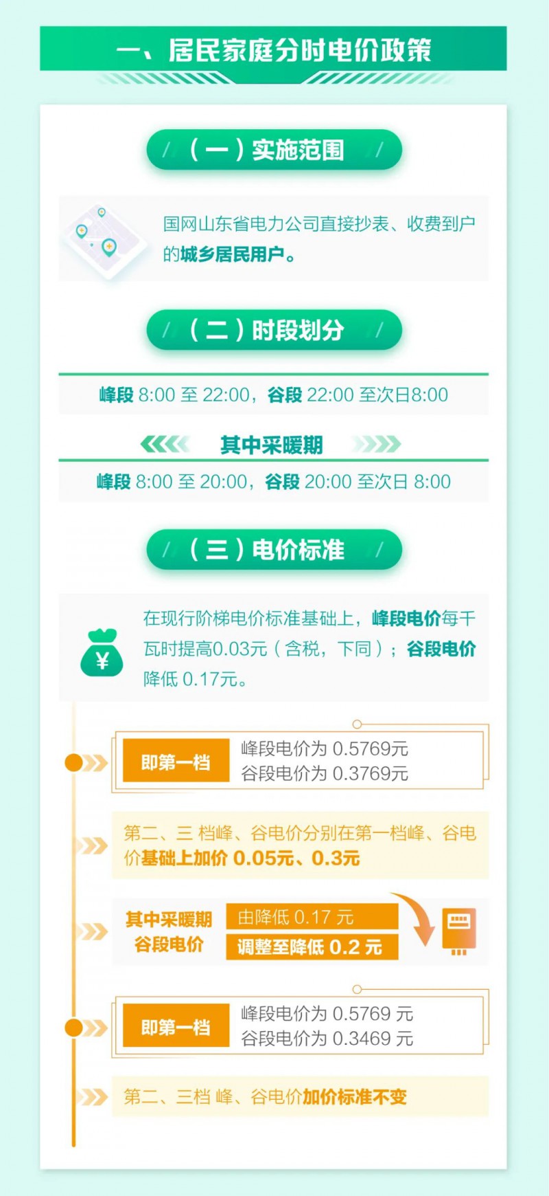 電價標(biāo)準(zhǔn):在現(xiàn)行階梯電價標(biāo)準(zhǔn)基礎(chǔ)上,峰段電價每千瓦時提高0.03元(含稅,下同);谷段電價降低0.17元。即第一檔峰段電價為0.5769元、谷段電價為0.3769元,第二、三檔峰、谷電價分別在第一檔峰、谷電價基礎(chǔ)上加價0.05元、0.3元;其中采暖期谷段電價由降低0.17元調(diào)整至降低0.2元。即第一檔峰段電價為0.5769元、谷段電價為0.3469元,第二、三檔峰、谷電價加價標(biāo)準(zhǔn)不變。