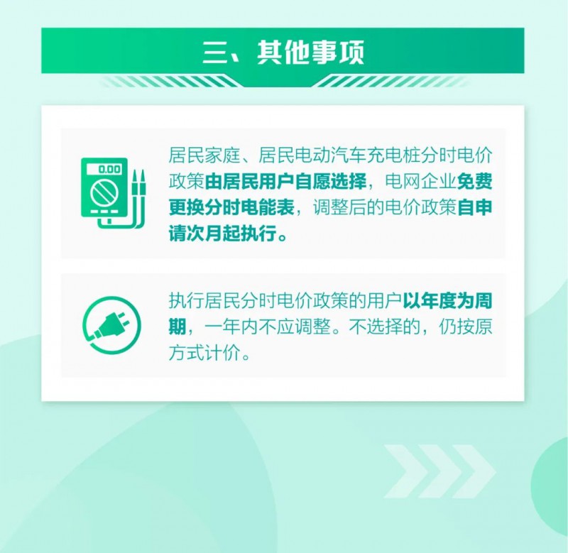 根據(jù)通知,居民家庭、居民電動汽車充電樁分時電價政策由居民用戶自愿選擇,電網(wǎng)企業(yè)免費更換分時電能表,調(diào)整后的電價政策自申請次月起執(zhí)行。執(zhí)行居民分時電價政策的用戶以年度為周期,一年內(nèi)不應(yīng)調(diào)整。不選擇的,仍按原方式計價。