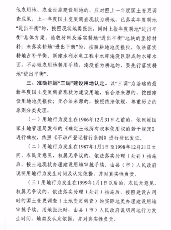 3月9日,自然資源部辦公廳印發(fā)《關(guān)于以"三調(diào)"成果為基礎(chǔ)做好建設(shè)用地審查報批地類認定的通知》,自4月15日起實施?!锻ㄖ访鞔_了建設(shè)用地審查報批時地類認定規(guī)則。對報批時現(xiàn)狀為建設(shè)用地的,應(yīng)根據(jù)其來源合法性進行分類處理。有合法來源的,按照建設(shè)用地地類報批;無合法來源的,按照建設(shè)占用時的國土變更調(diào)查(土地變更調(diào)查)的實際地類報批,地類為耕地的,應(yīng)依法落實耕地占補平衡。