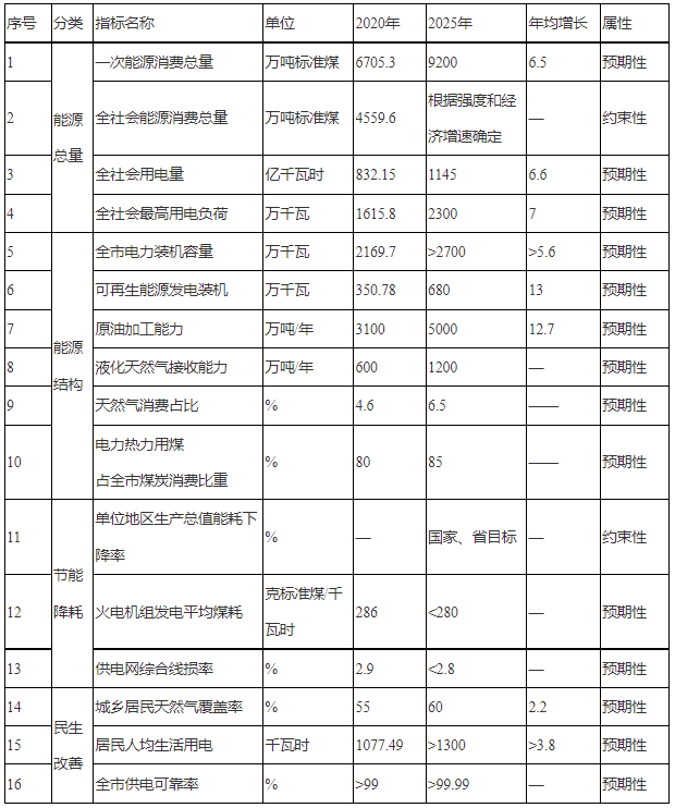 2.結(jié)構(gòu)目標。到2025年,全市電力裝機容量達到2700萬千瓦以上,其中,可再生能源發(fā)電裝機容量達到680萬千瓦以上,清潔能源發(fā)電裝機占電力總裝機容量達到45%以上;原油加工能力達到5000萬噸/年,液化天然氣接收能力達到1200萬噸/年;全市能源消費結(jié)構(gòu)進一步優(yōu)化,天然氣消費占比力爭達到6.5%;電力熱力用煤占全市煤炭消費比重達到85%以上。