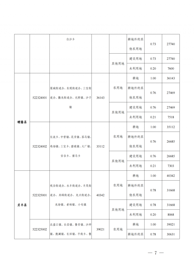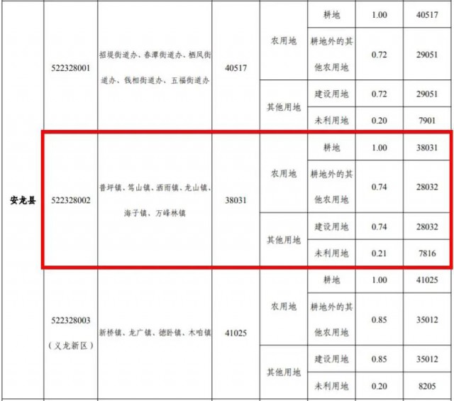 根據(jù)此前發(fā)布的《州人民政府關(guān)于公布實施黔西南州征地區(qū)片綜合地價補(bǔ)償更新標(biāo)準(zhǔn)的通知》(黔西南府函〔2020〕69號)補(bǔ)償標(biāo)準(zhǔn),安龍縣普坪鎮(zhèn)區(qū)片綜合地價為38031元/畝,其中農(nóng)用地耕地補(bǔ)償標(biāo)準(zhǔn)為38031元/畝,耕地外的其他農(nóng)用地補(bǔ)償標(biāo)準(zhǔn)為28032元/畝。