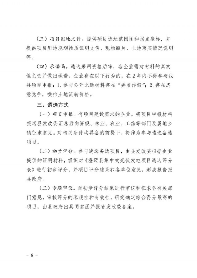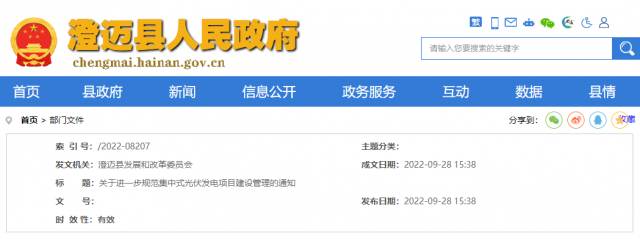 9月28日,澄邁縣政府網(wǎng)發(fā)布“關(guān)于進(jìn)一步規(guī)范集中式光伏發(fā)電項(xiàng)目建設(shè)管理的通知”。