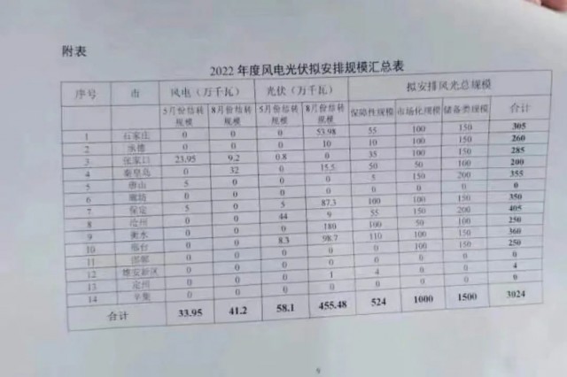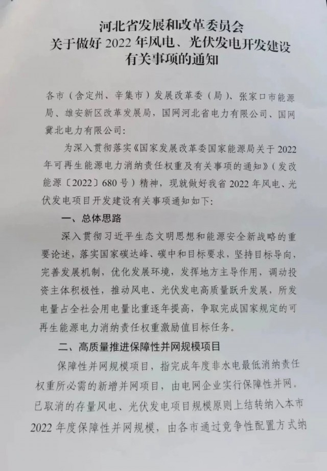 近日,河北省發(fā)改委發(fā)布《關(guān)于做好2022年風(fēng)電、光伏發(fā)電開(kāi)發(fā)建設(shè)有關(guān)事項(xiàng)的通知》,根據(jù)文件:河北2022年擬安排保障性風(fēng)電、光伏規(guī)模5.24GW,市場(chǎng)化規(guī)模10GW、儲(chǔ)備規(guī)模15GW。