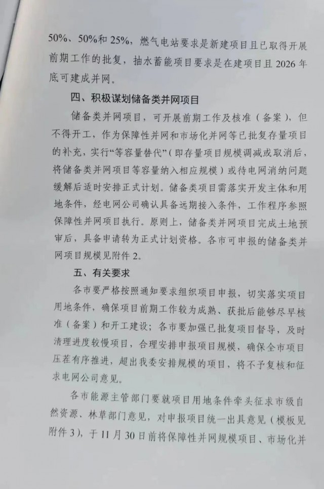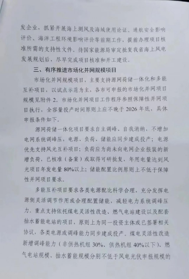 市場(chǎng)化項(xiàng)目參照保障性并網(wǎng)項(xiàng)目執(zhí)行,源網(wǎng)荷儲(chǔ)一體化項(xiàng)目年用電量要達(dá)到風(fēng)、光項(xiàng)目年發(fā)電量的80%以上,儲(chǔ)能配置要求不得低于保障性項(xiàng)目。多能互補(bǔ)項(xiàng)目煤電新增調(diào)峰能力、燃?xì)怆娬?、抽水蓄能?guī)模不得低于風(fēng)、光申報(bào)規(guī)模的50%、50%、25%。市場(chǎng)化項(xiàng)目全容量投產(chǎn)時(shí)間不晚于2026年底。