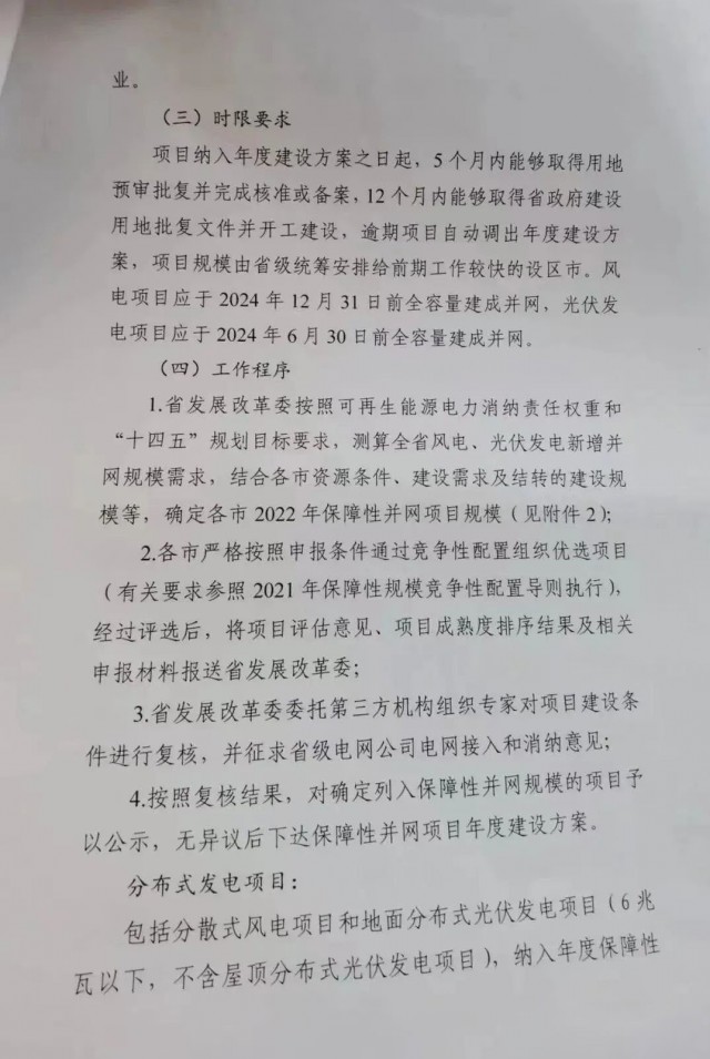 并網(wǎng)時(shí)限要求方面文件要求:保障性項(xiàng)目納入年度建設(shè)方案之日起,5個(gè)月內(nèi)能夠取得用地預(yù)審批復(fù)并完成核準(zhǔn)或備案,12個(gè)月內(nèi)能夠取得省政府建設(shè)用地批復(fù)文件并開(kāi)工建設(shè),逾期項(xiàng)目自動(dòng)調(diào)出年度建設(shè)方案,項(xiàng)目規(guī)模由省級(jí)統(tǒng)籌安排給前期工作較快的設(shè)區(qū)市。風(fēng)電項(xiàng)目應(yīng)于2024年12月31日前全容量建成并網(wǎng),光伏發(fā)電項(xiàng)目應(yīng)于2024年6月30日前全容量建成并網(wǎng)。