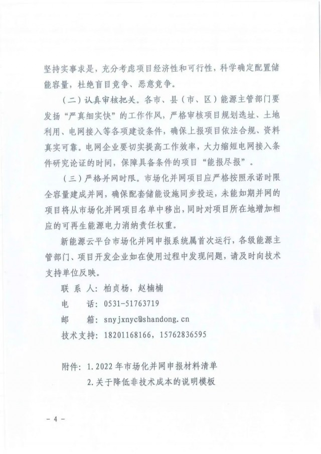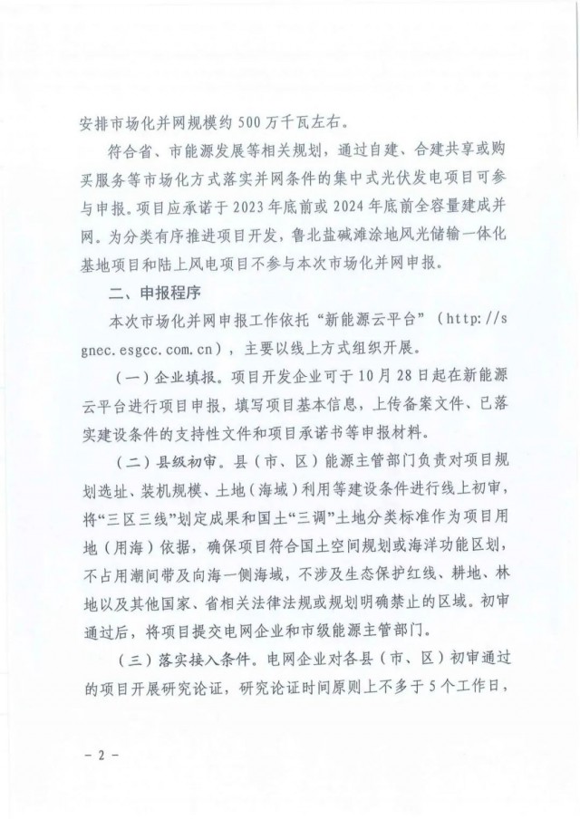 根據(jù)文件,綜合考慮可再生能源電力消納責(zé)任權(quán)重,2022年全省安排市場(chǎng)化并網(wǎng)規(guī)模約500萬千瓦左右,本批項(xiàng)目應(yīng)承諾于2023年底前或2024年底前全容量建成并網(wǎng)。另外,魯北鹽堿灘涂地風(fēng)光儲(chǔ)輸一體化基地項(xiàng)目和陸上風(fēng)電項(xiàng)目不參與本次市場(chǎng)化并網(wǎng)申報(bào)。