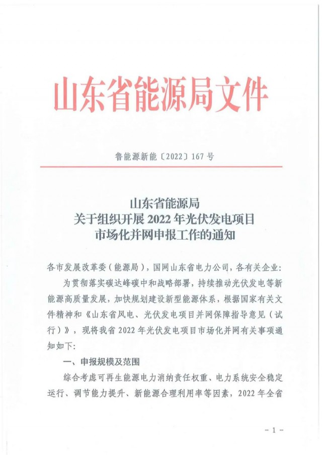 為貫徹落實(shí)碳達(dá)峰碳中和戰(zhàn)略部署,持續(xù)推動(dòng)光伏發(fā)電等新能源高質(zhì)量發(fā)展,加快規(guī)劃建設(shè)新型能源體系,根據(jù)國(guó)家有關(guān)文件精神和《山東省風(fēng)電、光伏發(fā)電項(xiàng)目并網(wǎng)保障指導(dǎo)意見(試行)》,現(xiàn)將我省2022年光伏發(fā)電項(xiàng)目市場(chǎng)化并網(wǎng)有關(guān)事項(xiàng)通知如下:
