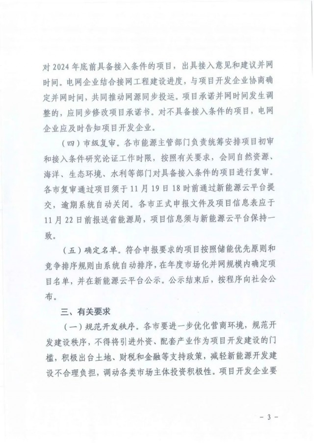 (四)市級(jí)復(fù)審。各市能源主管部門負(fù)責(zé)統(tǒng)籌安排項(xiàng)目初審和接入條件研究論證工作時(shí)限,按照有關(guān)要求,會(huì)同自然資源、海洋、生態(tài)環(huán)境、水利等部門對(duì)具備接入條件的項(xiàng)目進(jìn)行復(fù)審。各市復(fù)審?fù)ㄟ^項(xiàng)目須于11月19日18時(shí)前通過新能源云平臺(tái)提交,逾期系統(tǒng)自動(dòng)關(guān)閉。各市正式申報(bào)文件及項(xiàng)目信息表應(yīng)于11月22日前報(bào)送省能源局,項(xiàng)目信息須與新能源云平臺(tái)保持一致。