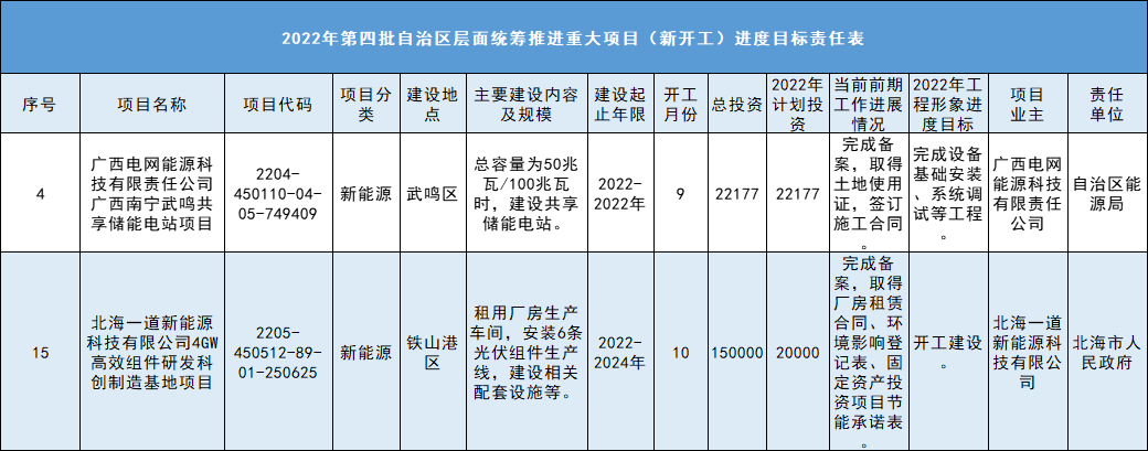 11月1日廣西壯族自治區(qū)重大項目建設(shè)推進領(lǐng)導(dǎo)小組辦公室印發(fā)2022年第四批自治區(qū)層面統(tǒng)籌推進重大項目方案的通知。其中,8個風(fēng)光項目進入2022年第四批自治區(qū)層面統(tǒng)籌推進重大項目(預(yù)備)進度目標(biāo)責(zé)任表;2個光伏等新能源項目進入2022年第四批自治區(qū)層面統(tǒng)籌推進重大項目(新開工)進度目標(biāo)責(zé)任表。