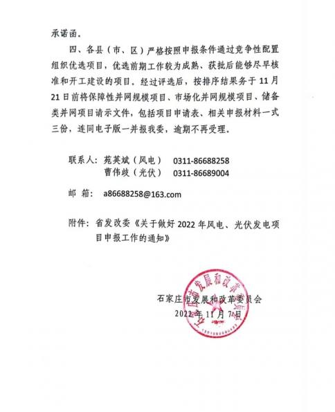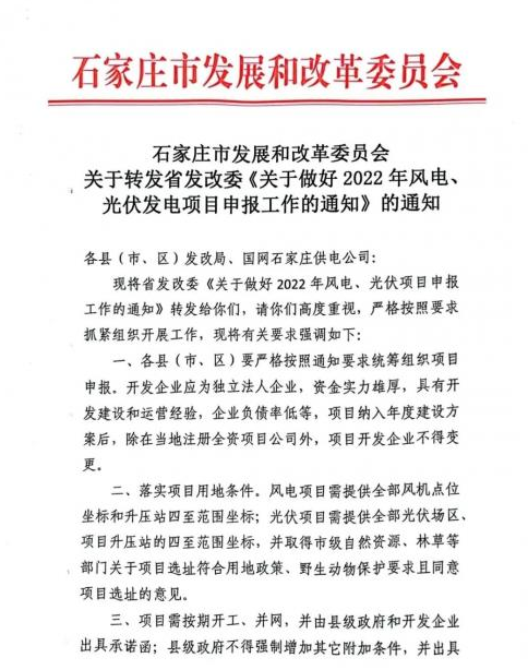 11月7日,河北省石家莊市發(fā)改委印發(fā)《關于做好2022年風電、光伏發(fā)電項目申報工作的通知》,要求項目需按期開工、并網,并由縣級政府和開發(fā)企業(yè)出具承諾函;縣級政府不得強制增加其它附加條件,并出具承諾函。
