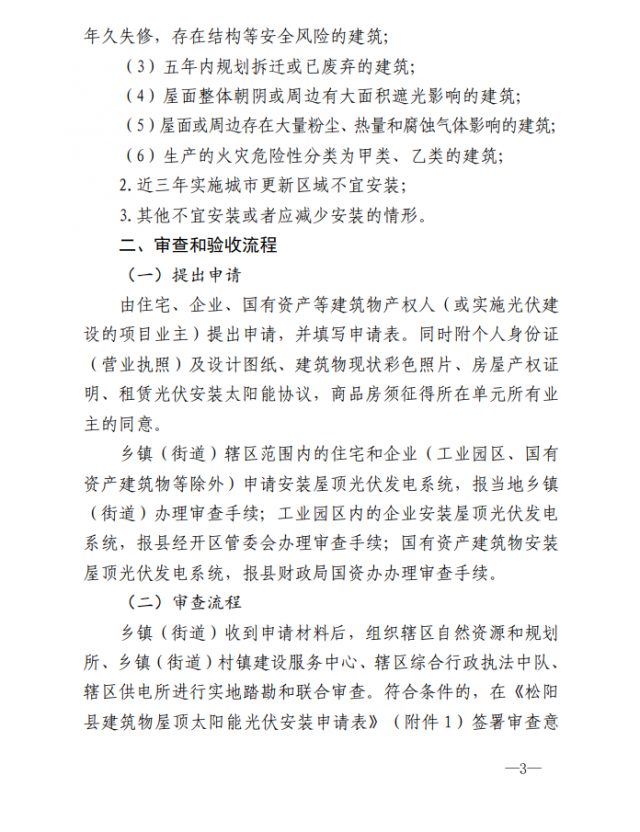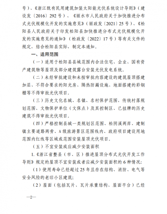 1、適用范圍:適用于松陽縣縣域范圍內(nèi)合法住宅、企業(yè)、國(guó)有資產(chǎn)建筑物等屋頂及部分建筑露臺(tái)安裝光伏發(fā)電系統(tǒng),并說明補(bǔ)充5類不得安裝或不宜安裝及減少安裝的情形。