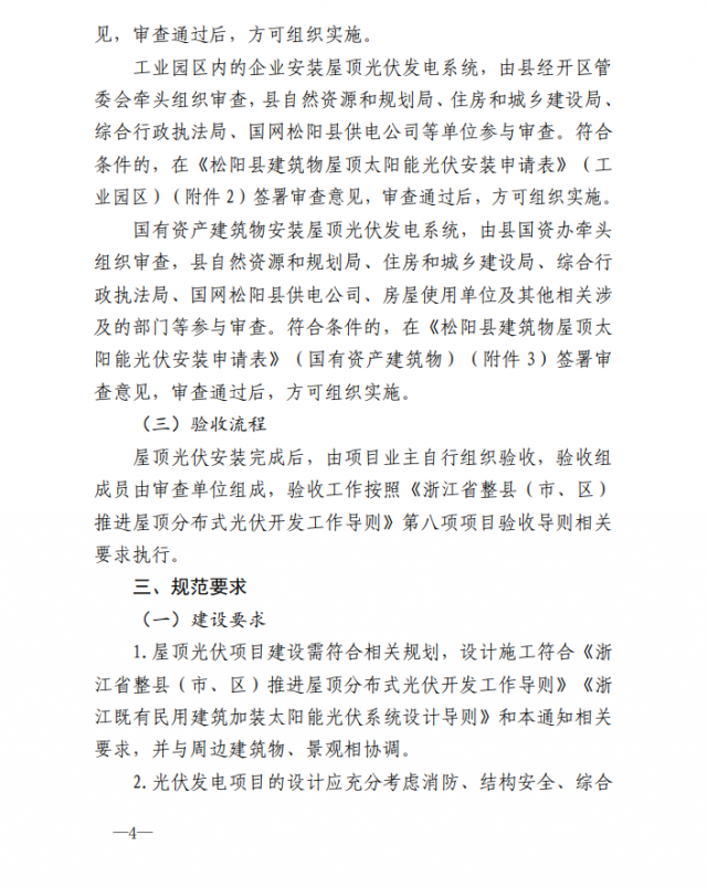 11月8日,浙江松陽縣發(fā)展和改革局關(guān)于松陽縣既有建筑屋頂加裝太陽能光伏發(fā)電系統(tǒng)辦理流程的通知印發(fā),通知對(duì)既有建筑屋頂加裝太陽能光伏發(fā)電系統(tǒng)適用范圍、審查和驗(yàn)收流程以及規(guī)范要求做出詳細(xì)規(guī)定。