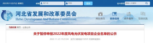11月23日,河北省發(fā)布《關(guān)于暫停申報(bào)2022年度風(fēng)電光伏發(fā)電項(xiàng)目企業(yè)名單》的公示。通知顯示,為進(jìn)一步加強(qiáng)風(fēng)電光伏發(fā)電項(xiàng)目管理,按照對(duì)存有逾期未全容量并網(wǎng)項(xiàng)目企業(yè),原則上在全省范圍內(nèi)暫停該項(xiàng)目相關(guān)企業(yè)當(dāng)年新增項(xiàng)目申報(bào)的政策要求,現(xiàn)將暫停申報(bào)2022年度保障類、市場化企業(yè)名單予以公示。