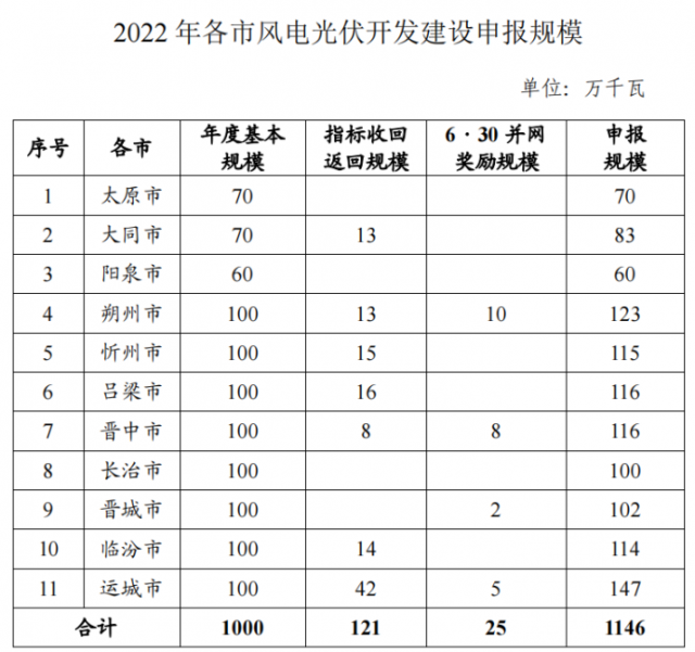 11月21日,山西省能源局發(fā)布了《2022年風(fēng)電、光伏發(fā)電開發(fā)建設(shè)競(jìng)爭(zhēng)性配置工作方案》(以下簡(jiǎn)稱《方案》),明確指出,綜合考慮全省全社會(huì)用電量、外送電量、電網(wǎng)消納能力、可再生能源消納責(zé)任權(quán)重目標(biāo)等因素,安排風(fēng)電、光伏發(fā)電保障性并網(wǎng)年度規(guī)模1000萬千瓦,獎(jiǎng)勵(lì)規(guī)模146萬千瓦。