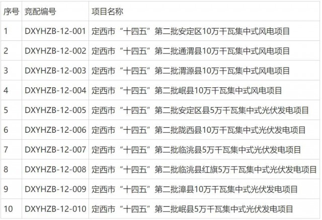 12月9日,甘肅省定西市發(fā)改委發(fā)布《定西市“十四五”第二批風(fēng)光電項目競爭性配置公告》,本次競爭性配置的總規(guī)模80萬千瓦,共有4個風(fēng)電項目(合計40萬千瓦)、6個光伏發(fā)電項目(合計40萬千瓦)同時競配。