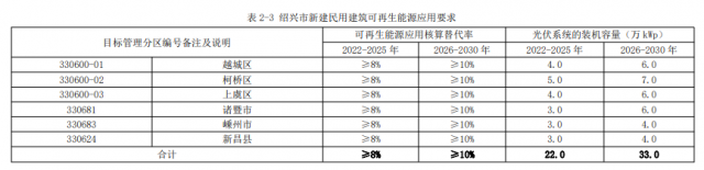 12月26日,紹興市建設(shè)局公示《紹興市綠色建筑專項規(guī)劃(2022-2030)(草案)》,其中提到,新建民用建筑(農(nóng)民自建住宅除外),應(yīng)當(dāng)按照國家和省有關(guān)標(biāo)準(zhǔn)利用可再生能源。可再生能源利用設(shè)施應(yīng)當(dāng)與建筑主體一體化設(shè)計,同步施工、同步驗收。新建民用建筑應(yīng)采用可再生能源系統(tǒng),應(yīng)配置太陽能系統(tǒng),滿足浙江省工程建設(shè)標(biāo)準(zhǔn)《民用建筑可再生能源應(yīng)用核算標(biāo)準(zhǔn)》的要求。 至2025 年,紹興市各縣(市、區(qū))新建民用建筑可再生能源應(yīng)用核算替代率達(dá)到 8%,太陽能光伏系統(tǒng)的裝機容量達(dá)到 22.0 萬 kWp。至 2030 年,紹興市各縣(市、區(qū))新建民用建筑可再生能源應(yīng)用核算替代率達(dá)到 10%,太陽能光伏系統(tǒng)的裝機容量達(dá)到 33.0 萬 kWp。