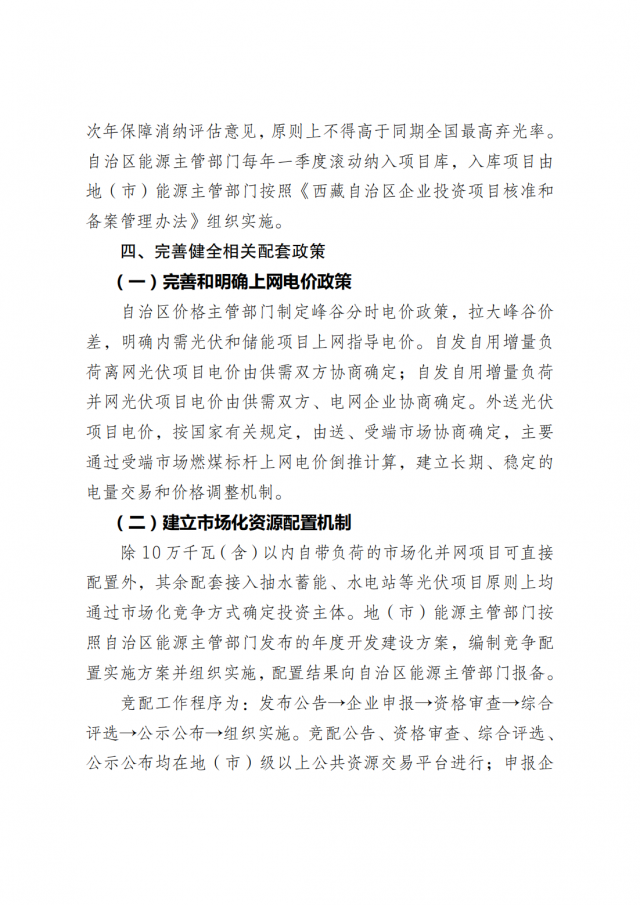 1月16日,西藏自治區(qū)發(fā)展和改革委員會(huì)印發(fā)《關(guān)于促進(jìn)西藏自治區(qū)光伏產(chǎn)業(yè)高質(zhì)量發(fā)展的意見(jiàn)》,保障性并網(wǎng)項(xiàng)目配置儲(chǔ)能規(guī)模不低于項(xiàng)目裝機(jī)容量的20%,儲(chǔ)能時(shí)長(zhǎng)不低于4小時(shí)。經(jīng)電網(wǎng)企業(yè)核定棄光率超過(guò)上一年度全區(qū)平均棄光率的地(市) 原則上不安排新增建設(shè)規(guī)模。