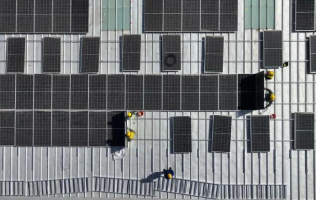 3月16日,工人在唐山市蘆臺(tái)經(jīng)濟(jì)開(kāi)發(fā)區(qū)一家企業(yè)廠(chǎng)房屋頂上安裝太陽(yáng)能光伏發(fā)電板(無(wú)人機(jī)照片)。