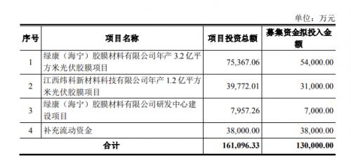 項(xiàng)目的實(shí)施主體為綠康(海寧)膠膜材料有限公司,實(shí)施地點(diǎn)為浙江省海寧市黃灣鎮(zhèn)海市路35號。項(xiàng)目總投資為75,367.06萬元,擬使用募集資金投入54,000.00萬元。本項(xiàng)目建設(shè)期為12個月,項(xiàng)目建設(shè)完成后將新增16,000萬平方米POE光伏膠膜、12,000萬平方米EVA光伏膠膜和4,000萬平方米EPE光伏膠膜產(chǎn)能,有助于公司進(jìn)一步提高光伏膠膜的生產(chǎn)能力和市場占有率,加快業(yè)務(wù)轉(zhuǎn)型步伐,提升公司市場競爭力。