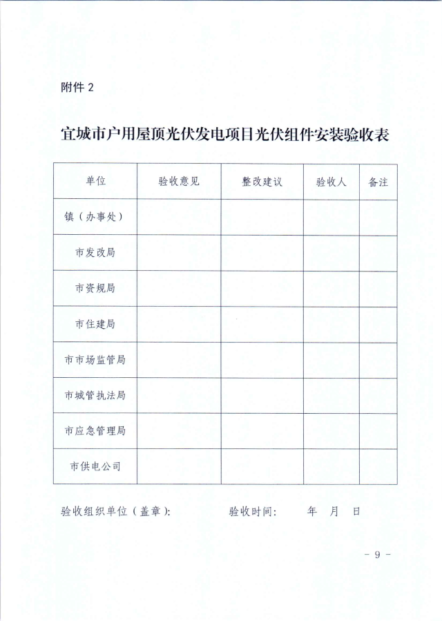 屋頂光伏在組件安裝完成后,業(yè)主需向?qū)俚劓?zhèn)、經(jīng)濟(jì)開發(fā)區(qū)提出驗(yàn)收申請(qǐng),然后會(huì)同市發(fā)改局、自然資源和規(guī)劃局、住建局、市場(chǎng)監(jiān)管局、城管執(zhí)法局、應(yīng)急管理局、供電公司等部門聯(lián)合驗(yàn)收并出具驗(yàn)收意見。