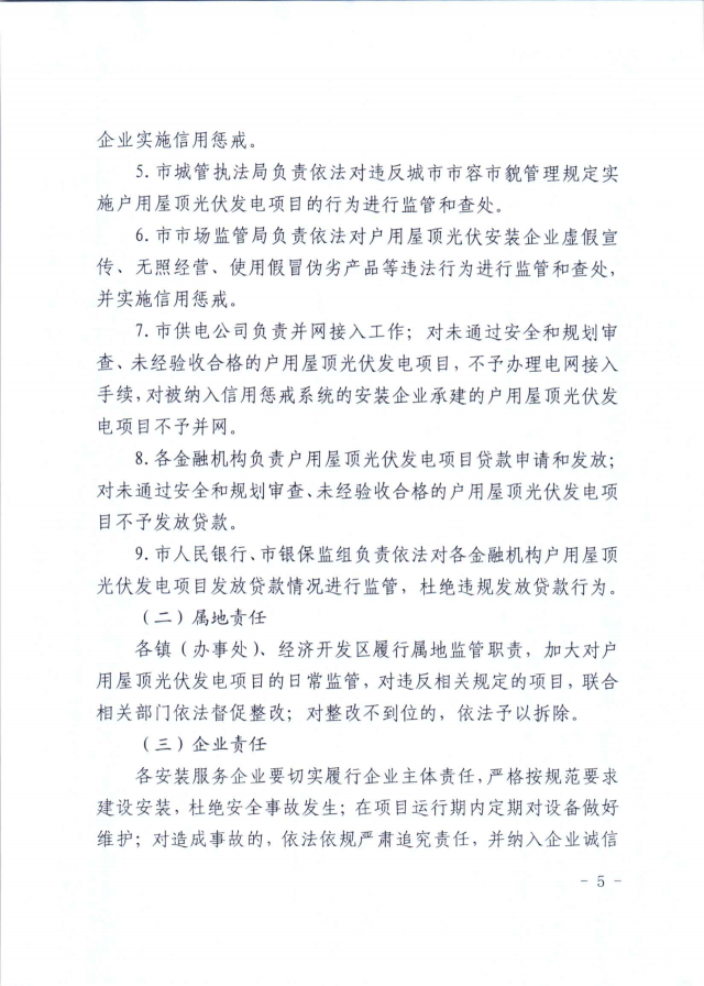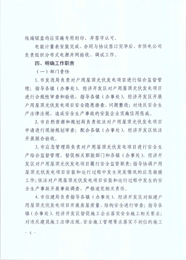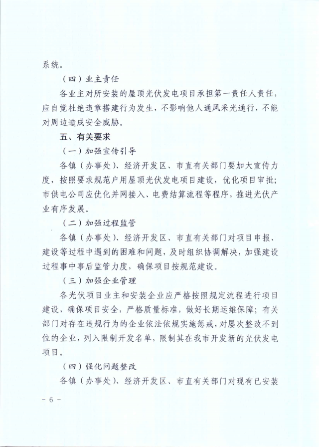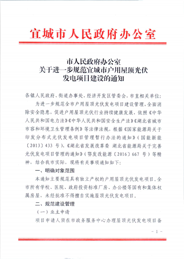 近日,湖北宜城發(fā)布《關(guān)于進(jìn)一步規(guī)范宜城市戶用屋頂光伏發(fā)電項(xiàng)目建設(shè)的通知》,明確指出全市所有學(xué)校、醫(yī)院、政府投資標(biāo)準(zhǔn)廠房、辦公樓等國(guó)有和集體權(quán)屬房屋,未經(jīng)批準(zhǔn)不得擅自實(shí)施屋頂光伏發(fā)電項(xiàng)目,而戶用光伏項(xiàng)目并網(wǎng)需要8個(gè)部門的簽字。