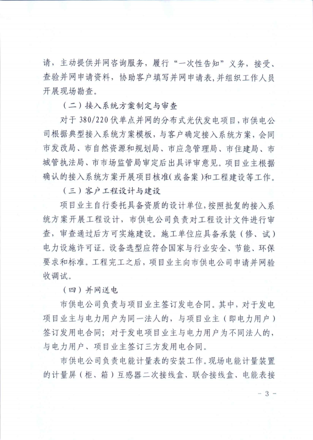 并網(wǎng)方面,則是對(duì)于380/220伏單點(diǎn)并網(wǎng)的分布式光伏發(fā)電項(xiàng)目,市供電公司根據(jù)典型接入系統(tǒng)方案模板,與客戶確定接入系統(tǒng)方案,會(huì)同市發(fā)改局、市自然資源和規(guī)劃局、市應(yīng)急管理局、市住建局、市城管執(zhí)法局、市市場(chǎng)監(jiān)管局審定后出具評(píng)審意見。項(xiàng)目業(yè)主根據(jù)確認(rèn)的接入系統(tǒng)方案開展項(xiàng)目核準(zhǔn)(或備案)和工程建設(shè)等工作。