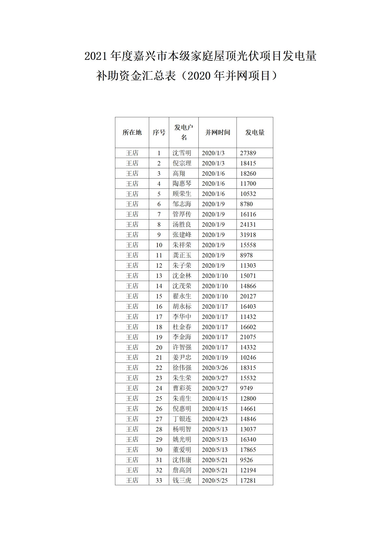 附件:2021年度嘉興市本級家庭屋頂光伏發(fā)電量(2020年并網(wǎng))補(bǔ)助資金公示