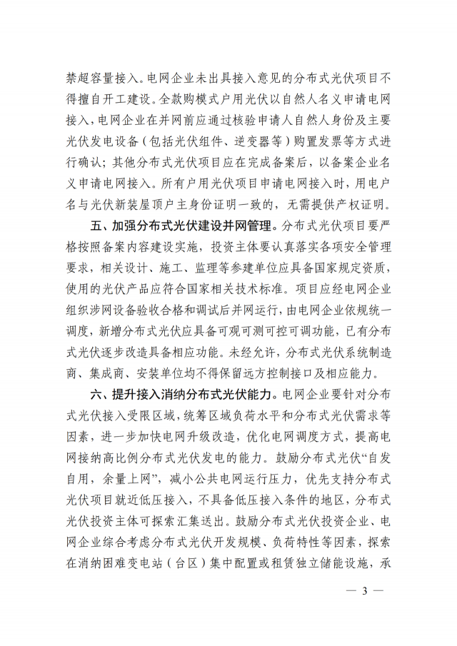 項目應(yīng)經(jīng)電網(wǎng)企業(yè)組織涉網(wǎng)設(shè)備驗收合格和調(diào)試后并網(wǎng)運行,由電網(wǎng)企業(yè)依規(guī)統(tǒng)一調(diào)度,新增分布式光伏應(yīng)具備可觀可測可控可調(diào)功能,已有分布式光伏逐步改造具備相應(yīng)功能。