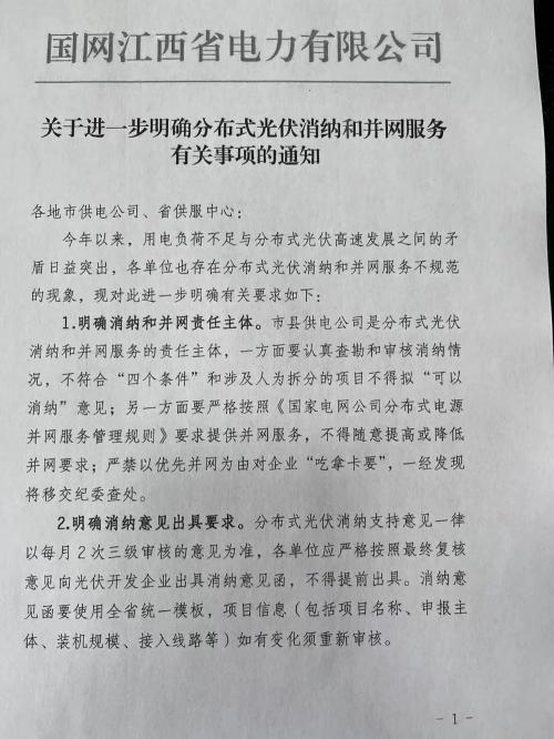 日前,國網(wǎng)江西省下發(fā)《關(guān)于進(jìn)一步明確分布式光伏消納和并網(wǎng)服務(wù)有關(guān)事項(xiàng)的通知》,明確要求紅色預(yù)警地區(qū)暫停戶用光伏并網(wǎng),企業(yè)租用屋頂開發(fā)的戶用光伏按非自然人管理或暫停接入,任何項(xiàng)目未經(jīng)三級審核均不得出具消納意見。