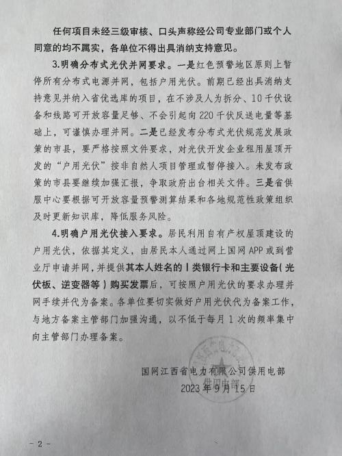 據(jù)網(wǎng)絡媒體消息:近日,國網(wǎng)江西省下發(fā)《關于進一步明確分布式光伏消納和并網(wǎng)服務有關事項的通知》,明確要求紅色預警地區(qū)暫停戶用光伏并網(wǎng),對光伏開發(fā)企業(yè)租用屋頂開發(fā)的“戶用光伏”按非自然人項目管理或暫停接入,加強出具“消納意見”的管理,任何項目未經(jīng)三級審核均不得出具消納意見。