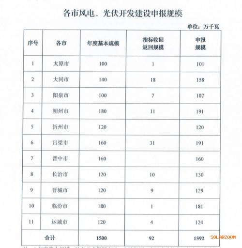 本次優(yōu)選擬擬安排風電、光伏保障性并網(wǎng)規(guī)模1500萬千瓦,返回規(guī)模92萬千瓦,合計1592萬千瓦。需要注意的是,晉北采煤沉陷區(qū)6GW新能源基地涉及的6區(qū)縣不再布局省內(nèi)自用保障性并網(wǎng)光伏發(fā)電項目,但其土地資源優(yōu)先保障晉北新能源基地光伏發(fā)電項目。各市擬安排規(guī)模見下: