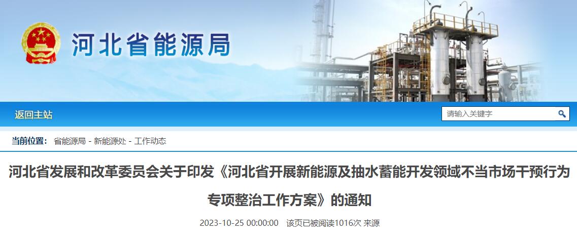 10月25日,河北省發(fā)展和改革委員會發(fā)布關于印發(fā)《河北省開展新能源及抽水蓄能開發(fā)領域不當市場干預行為專項整治工作方案》(以下簡稱《方案》)的通知。