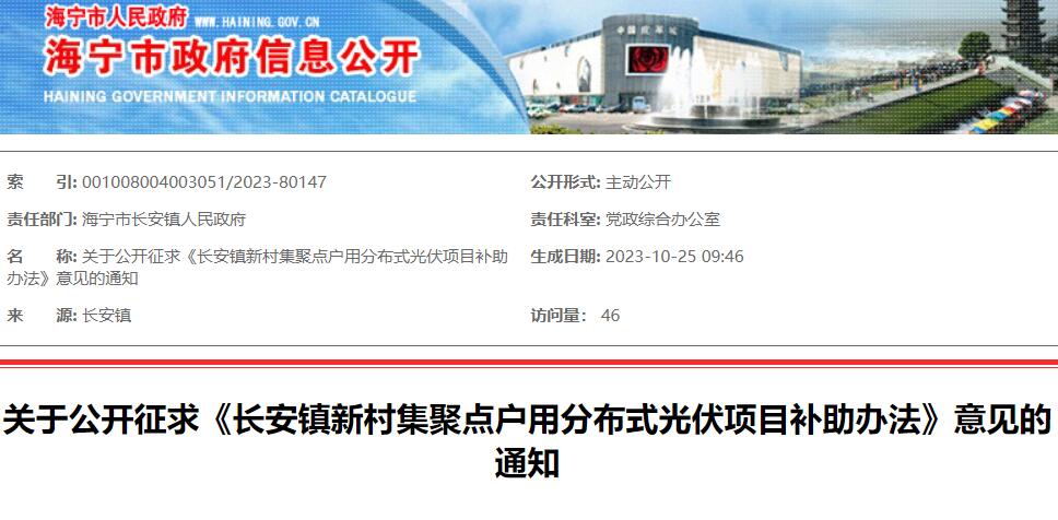 10月25日,浙江海寧市長安鎮(zhèn)人民政府關于公開征求《長安鎮(zhèn)新村集聚點戶用分布式光伏項目補助辦法》意見的通知。文件指出,為加快統(tǒng)籌推進全鎮(zhèn)新村集聚點戶用分布式光伏項目建設,特制《長安鎮(zhèn)新村集聚點戶用分布式光伏項目補助辦法》。