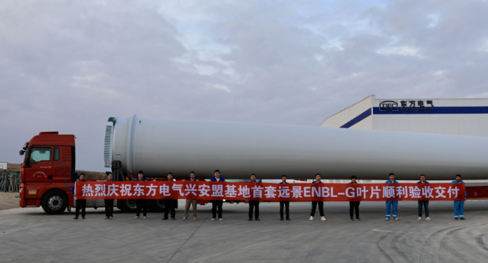 近日,大唐吉林前郭20萬千瓦風電項目首套ENBL-G型葉片在東方風電興安盟制造基地成功產(chǎn)出并發(fā)運,項目計劃交付22套ENBL-G型葉片。