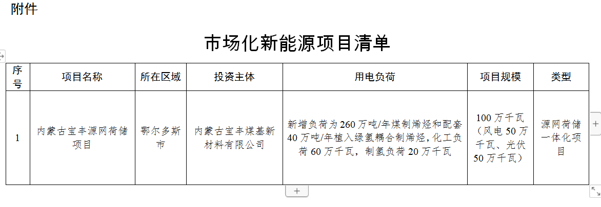 內(nèi)蒙古寶豐源網(wǎng)荷儲一體化項(xiàng)目,新增負(fù)荷為260萬噸/年煤制烯烴和配套40萬噸/年植入綠氫耦合制烯烴,化工負(fù)荷60萬千瓦,制氫負(fù)荷20萬千瓦,新能源建設(shè)規(guī)模為100萬千瓦(其中,風(fēng)電50萬千瓦、光伏50萬千瓦),儲能規(guī)模為20萬千瓦/60萬千瓦時(shí)。