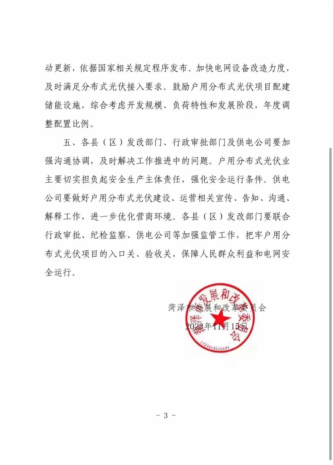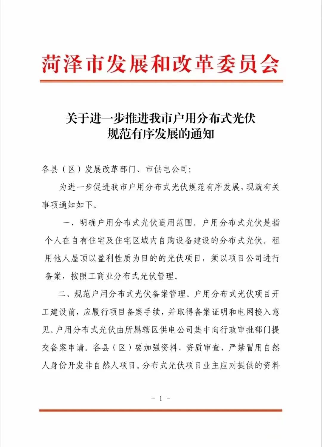 山東菏澤市發(fā)展和改革委員會(huì)下《發(fā)關(guān)于進(jìn)一步推進(jìn)我市戶(hù)用分布式光伏規(guī)范有序發(fā)展的通知》。
