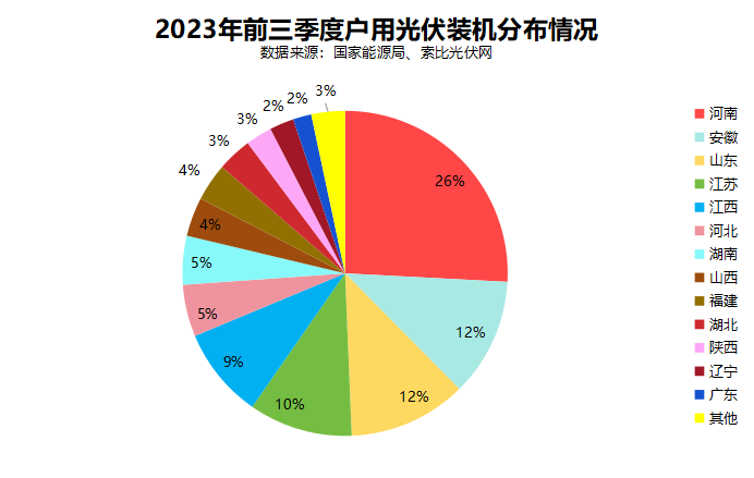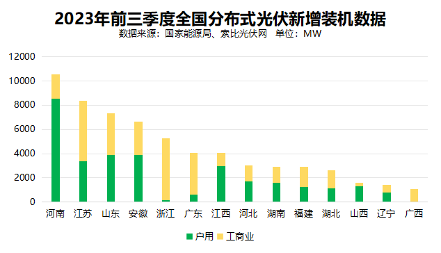 光伏發(fā)電方面,2023年前三季度,光伏新增裝機(jī)12894萬千瓦(128.94GW),同比增長145%,其中集中式光伏6180萬千瓦(61.8GW),分布式光伏6714萬千瓦(67.14GW),分布式光伏占比超過52%。分地區(qū)看,河南、山東、江蘇、湖北等11個省(自治區(qū)),前三季度光伏發(fā)電新增裝機(jī)超過5GW,其中7省的分布式光伏占比都超過一半。最高的河南省,分布式光伏占比超過98.6%,成為名副其實的“分布式光伏發(fā)展熱土”。