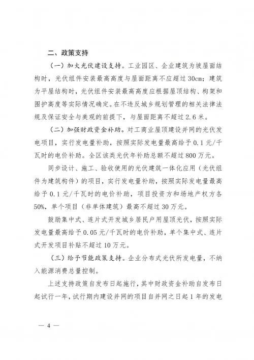 政策方面,文件指出,對工商業(yè)屋頂建設(shè)并網(wǎng)的光伏發(fā)電項目,實行發(fā)電量補助,按照實際發(fā)電量最高給予0.1元/千瓦時的電價補助。全區(qū)該類光伏年補助總額不超過800萬元。同步設(shè)計、施工、驗收使用的光伏建筑一體化應(yīng)用(光伏組件為建筑構(gòu)件)的項目,實行發(fā)電量補助,按照實際發(fā)電量最高給予0.1元/千瓦時的電價補助,項目投資方和場地產(chǎn)權(quán)方各50%,單個項目(非單體建筑)最高不超過30萬元。鼓勵集中式、連片式開發(fā)城鄉(xiāng)居民戶用屋頂光伏,按照實際發(fā)電量最高給予0.05元/千瓦時的電價補助,單個集中式、連片式開發(fā)項目補貼不超過10萬元。