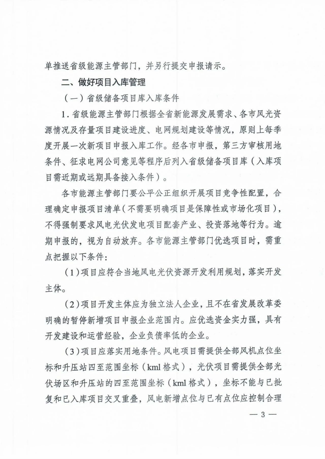 各市需公平開展項(xiàng)目競配,無需確定項(xiàng)目類型,但不得強(qiáng)制要求產(chǎn)業(yè)配套、投資落地等。項(xiàng)目應(yīng)落實(shí)用地條件,風(fēng)電項(xiàng)目需提供全部風(fēng)機(jī)點(diǎn)位坐標(biāo)和升壓站四至范圍坐標(biāo)(kml格式),光伏項(xiàng)目需提供全部光伏場區(qū)和升壓站的四至范圍坐標(biāo)(kml格式),坐標(biāo)不能與已批復(fù)和已入庫項(xiàng)目交叉重疊。項(xiàng)目應(yīng)承諾按要求配置儲能等調(diào)峰設(shè)施,入庫時不需要明確配置比例,出庫時按當(dāng)年開發(fā)建設(shè)方案要求配置儲能。