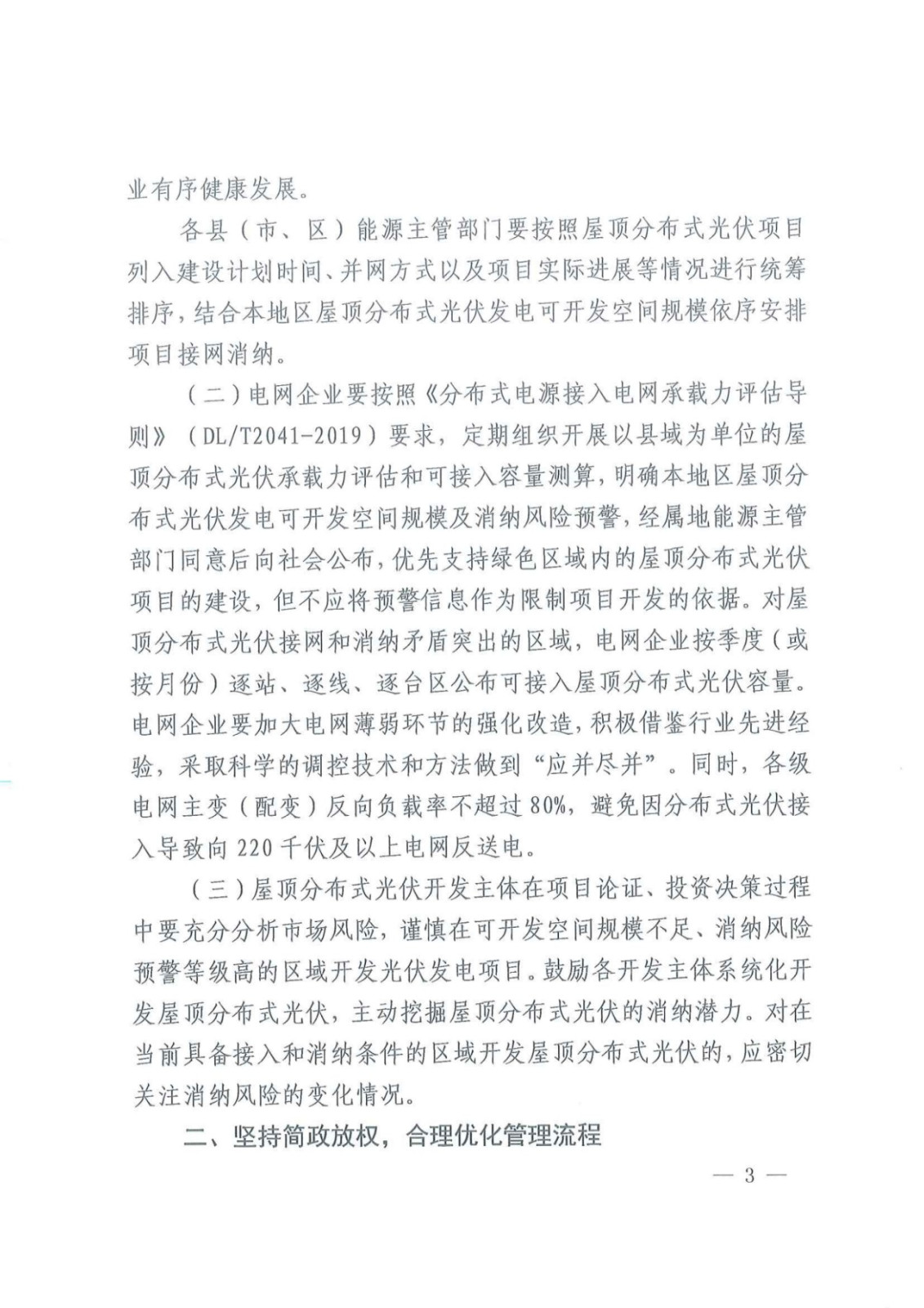 各級能源主管部門要加強新能源與火電、抽蓄、儲能和高載能項目等協(xié)同規(guī)劃,電網(wǎng)企業(yè)要定期組織開展以縣域為單位的屋頂分布式光伏承載力評估和可接入容量測算,明確可開發(fā)空間規(guī)模及消納風險預(yù)警。