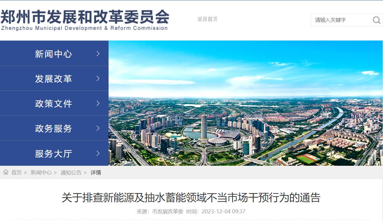 12月4日,河南鄭州發(fā)改委發(fā)布關于排查新能源及抽水蓄能領域不當市場干預行為的通告。一是強制要求配套產(chǎn)業(yè)。今年以來新能源及抽水蓄能領域,區(qū)縣(市)政府或相關部門,是否在相關文件中明確或者變相要求項目必須配套產(chǎn)業(yè)或者引入產(chǎn)業(yè);雖未明文規(guī)定,是否口頭強制要求配套產(chǎn)業(yè),或?qū)τ跊]有允諾配套產(chǎn)業(yè)的項目和投資主體給予阻礙或明顯歧視政策。